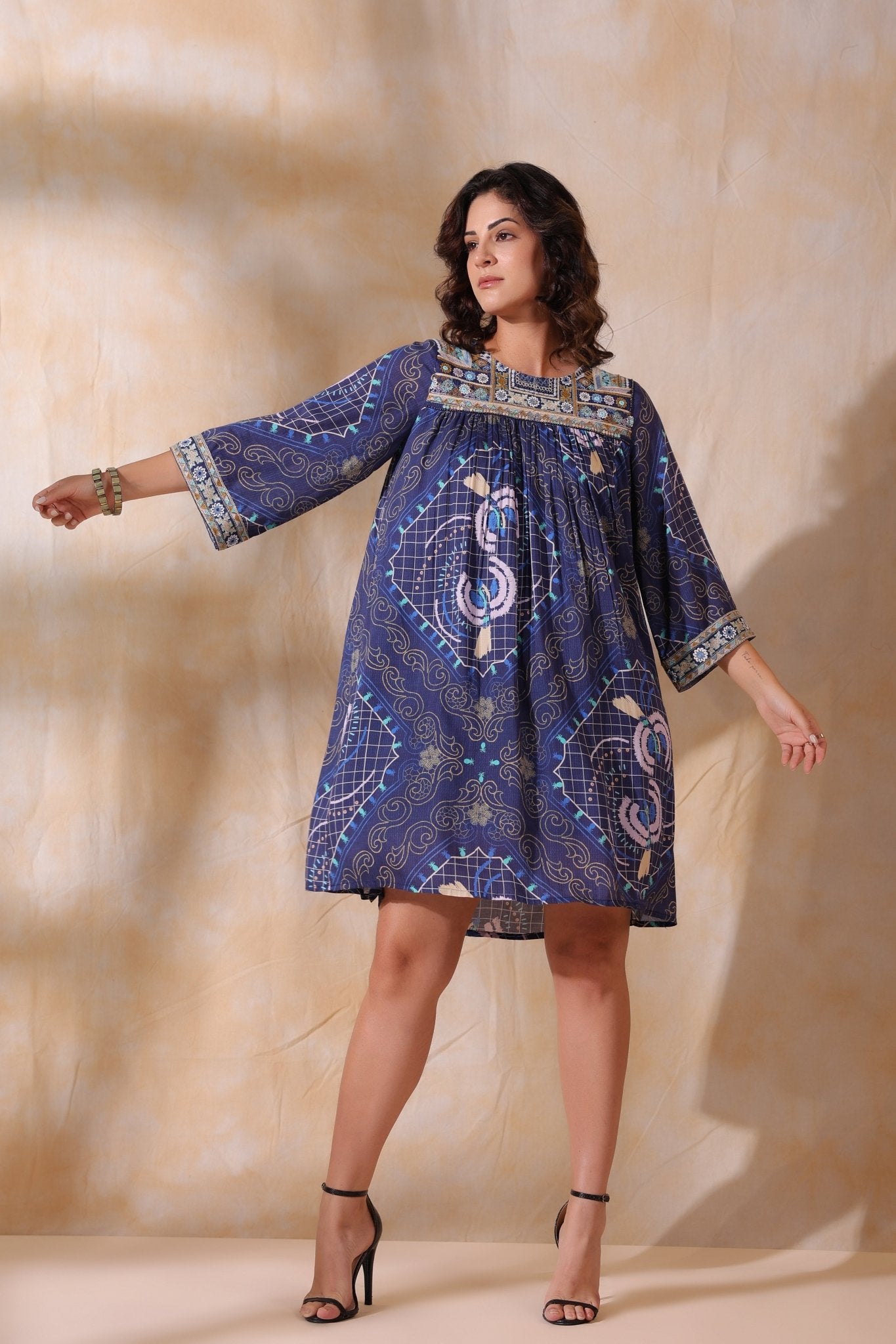 Women’s Viscose Blue Santoon Digital Printed Embroidery & Beads Work Mini Dress