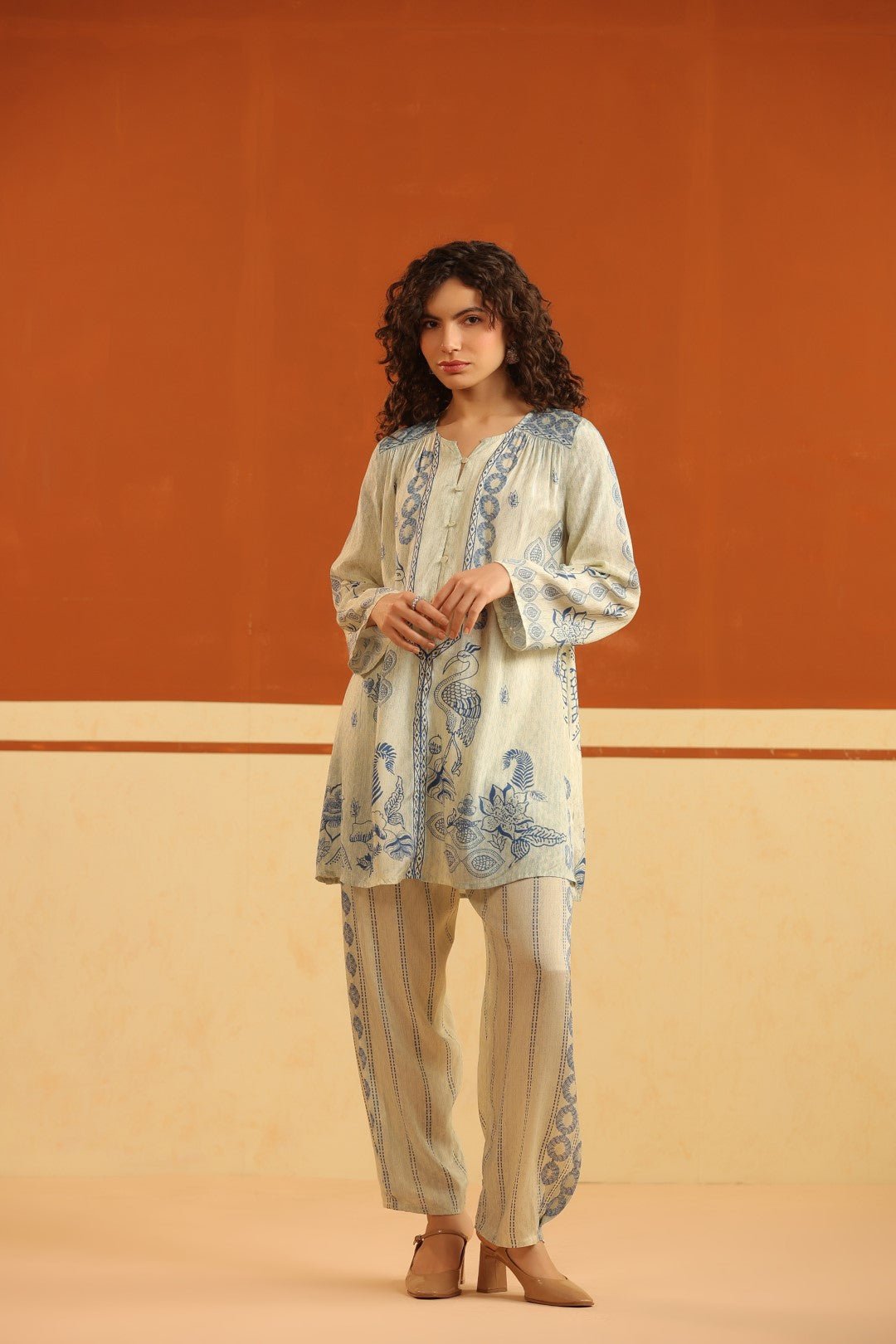 Ivory & Blue Printed Viscose Santoon Kurti & Pant Set for Women