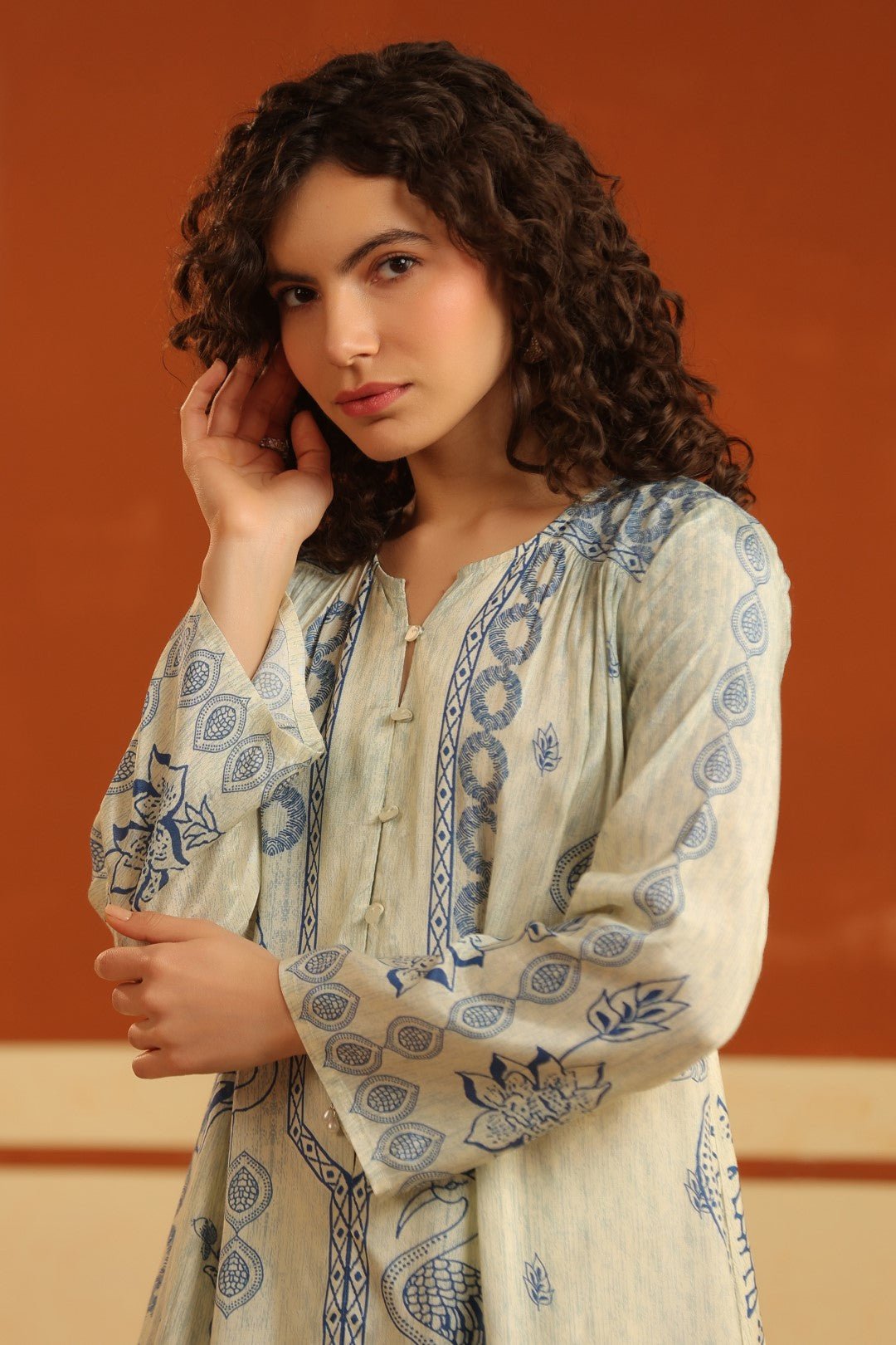Elegant ivory base with blue ethnic print