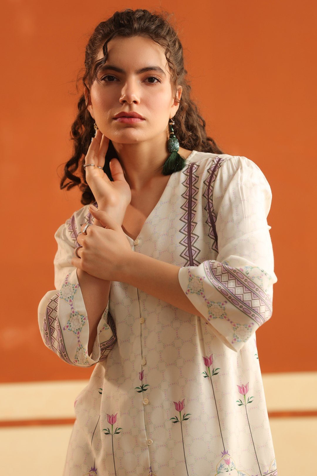 Print: Subtle floral motifs with ethnic border accents