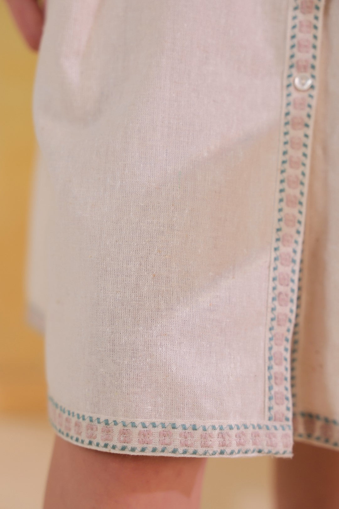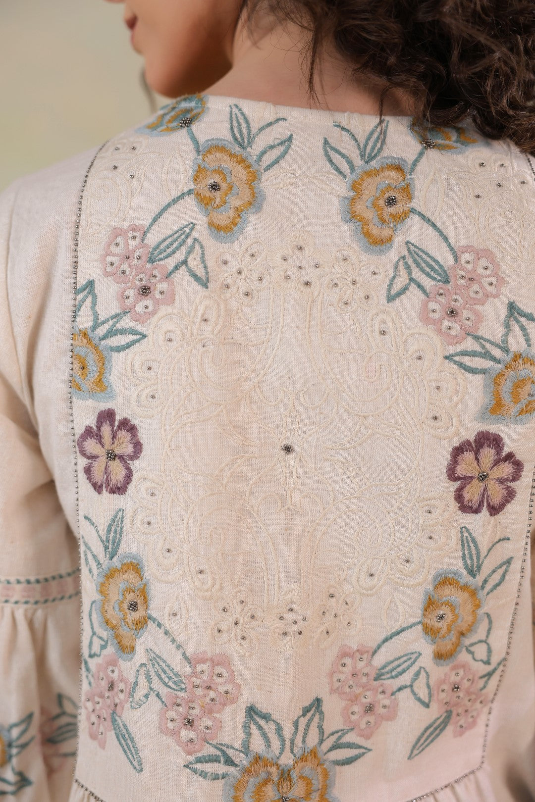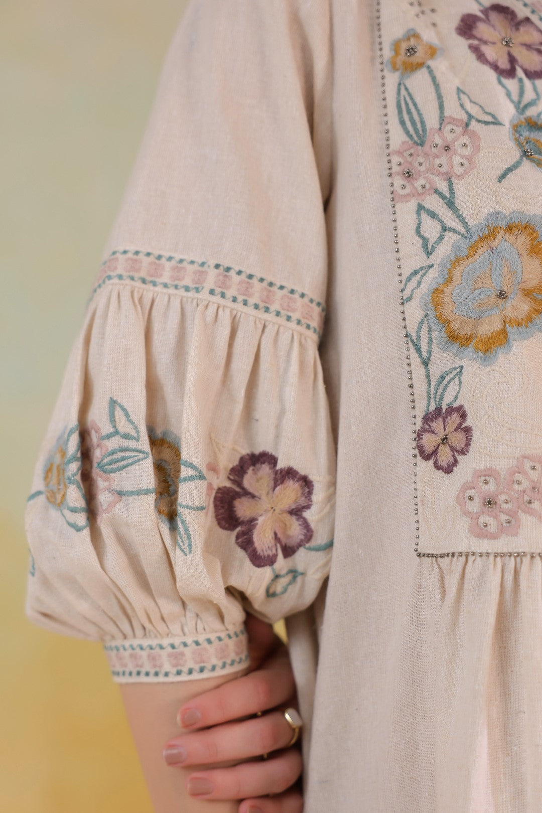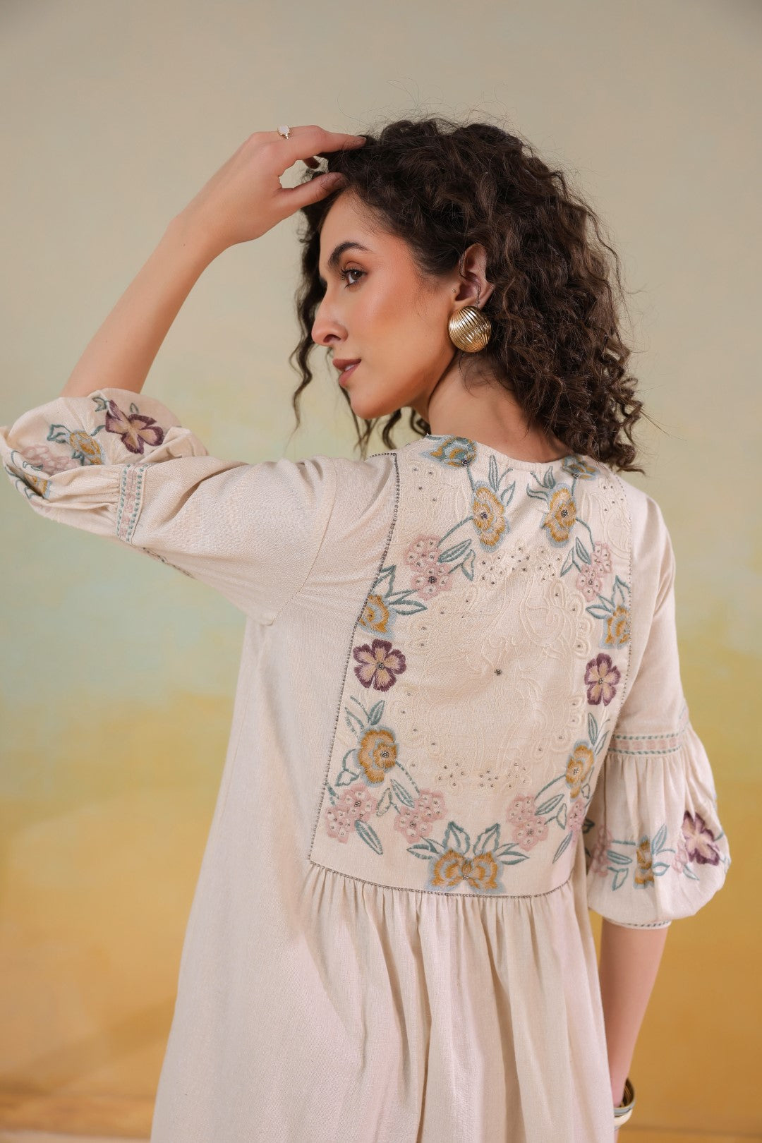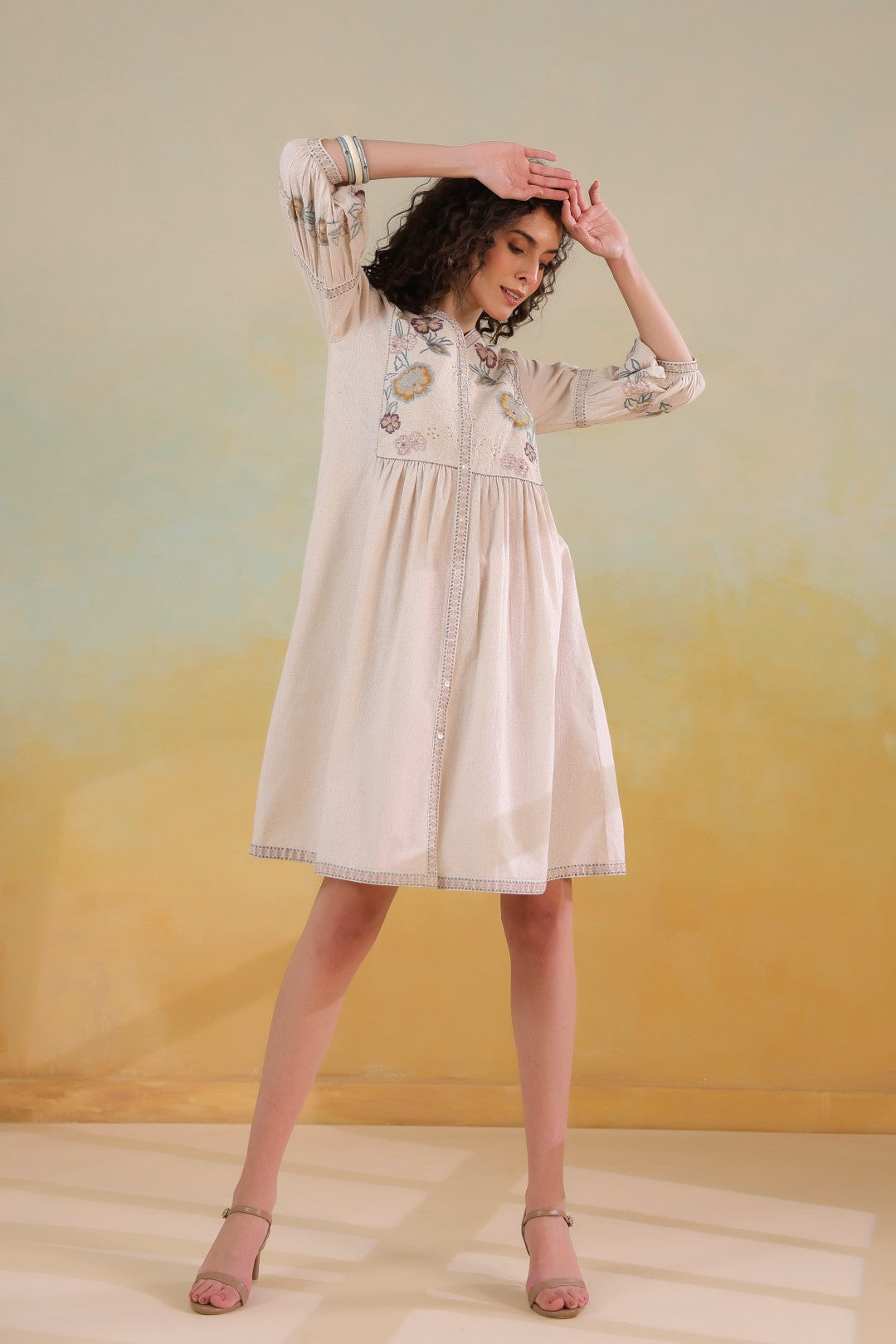 Refresh your wardrobe with this Nyaro Signature Off-White Dress, crafted from soft and breathable Cotton Flex fabric. Featuring delicate floral embroidery on the yoke and sleeves with a flowy silhouette, this dress blends effortless comfort with understated elegance.