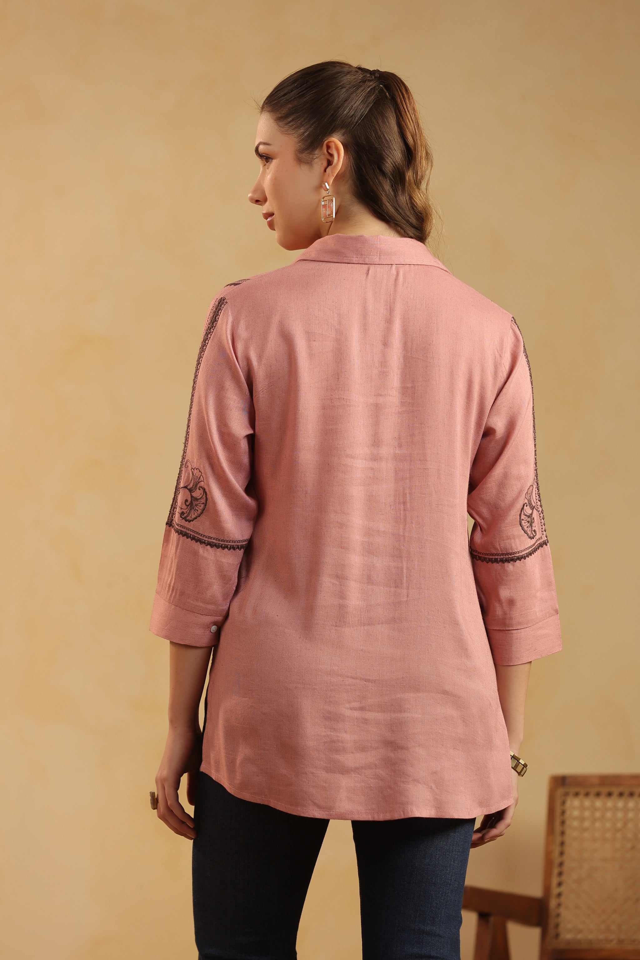 Dusty Pink Embroidered Cotton Linen Shirt Style Top for Women