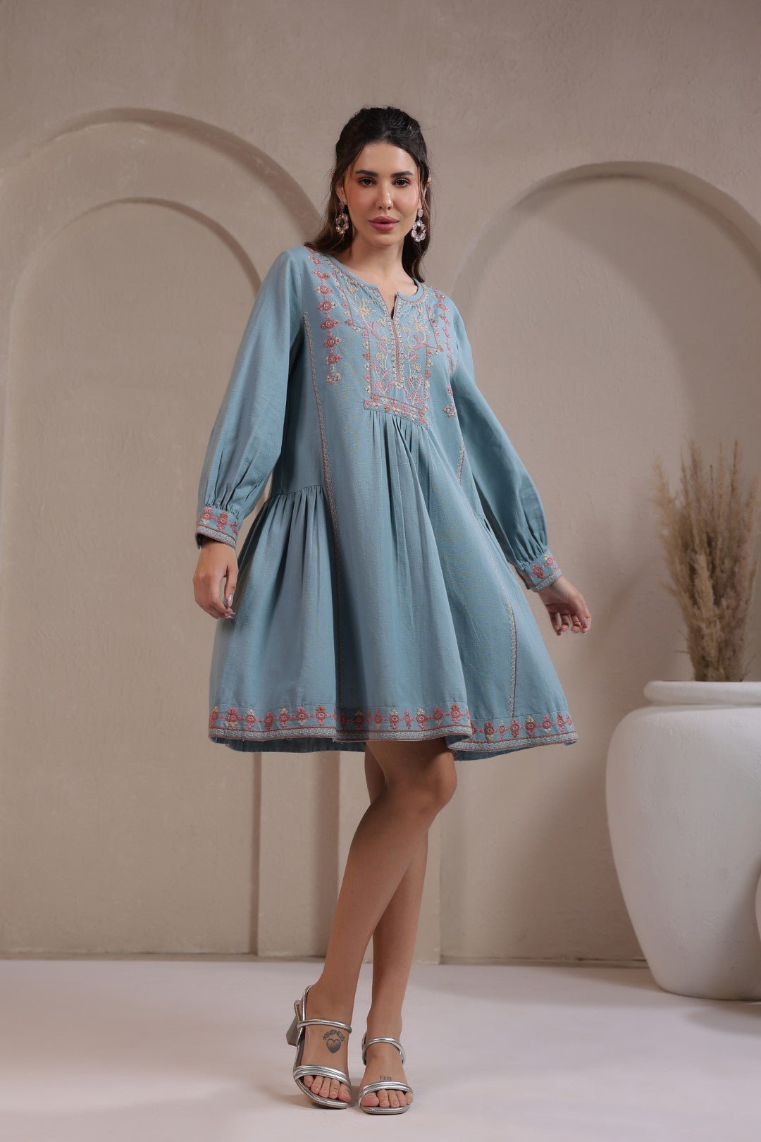 Nyaro Signature Cotton Flex Embroidered A-Line Dress – Blue