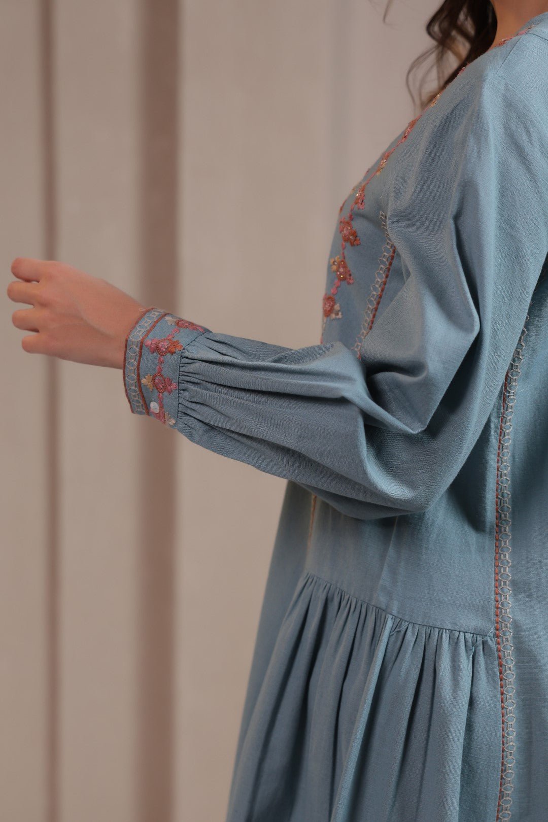 Step into effortless elegance with this Nyaro Signature Blue Dress, crafted from breathable Cotton Flex fabric. Accentuated with delicate contrast embroidery on the yoke, sleeves, and hemline, this flared silhouette blends everyday comfort with refined ethnic charm.