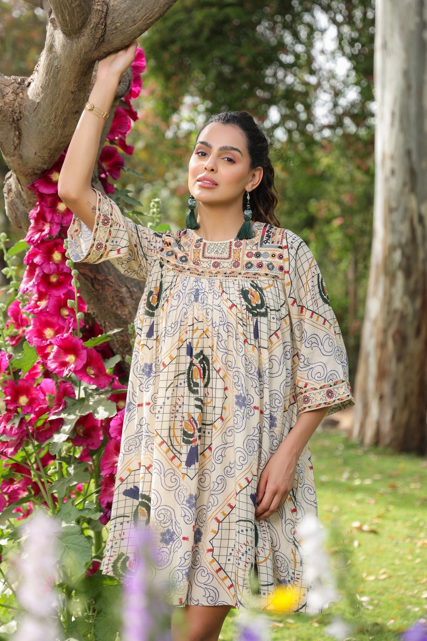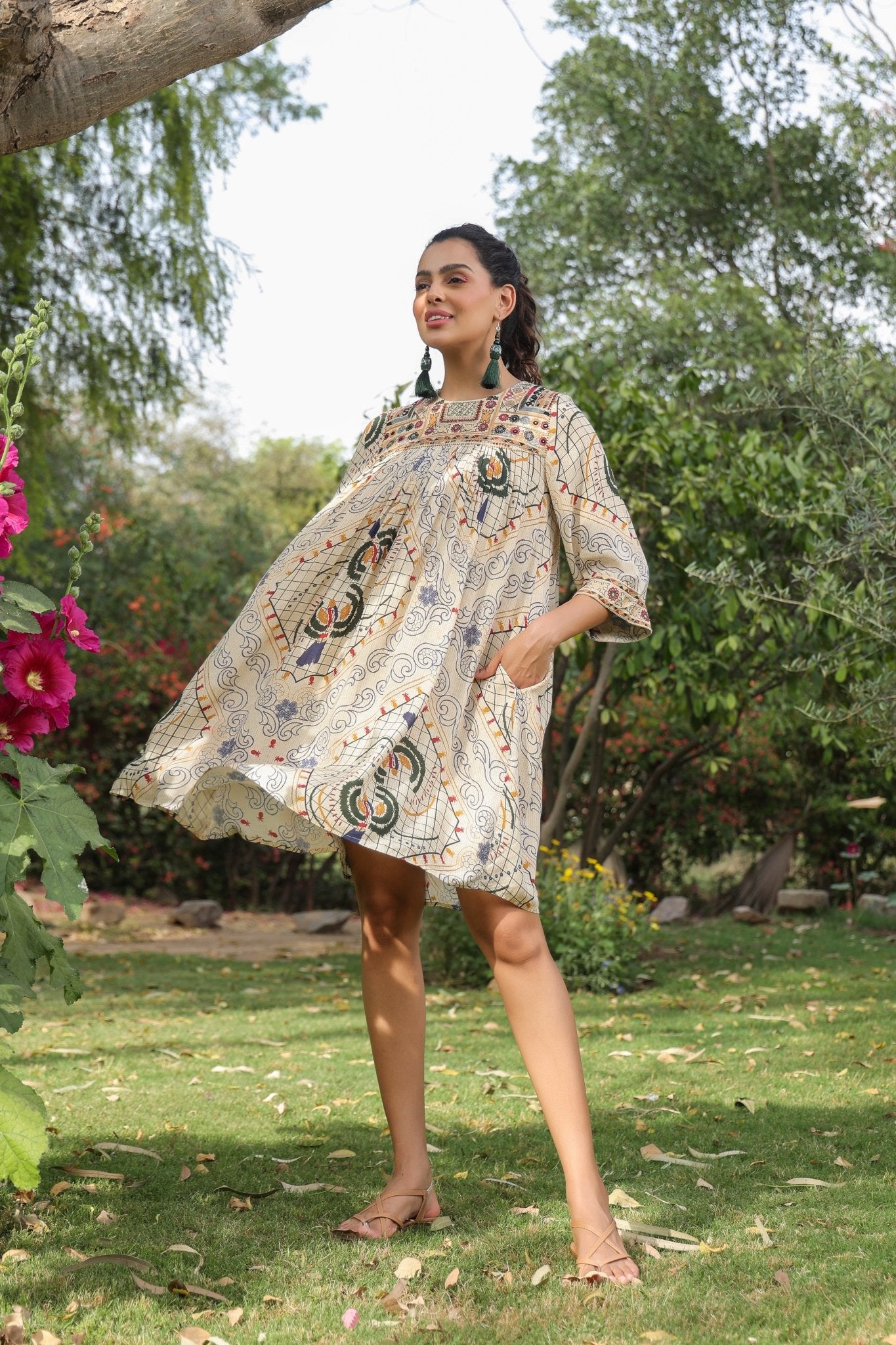 Women Viscose Santoon Digital Printed Embroidery And Beads Work Mini Dress